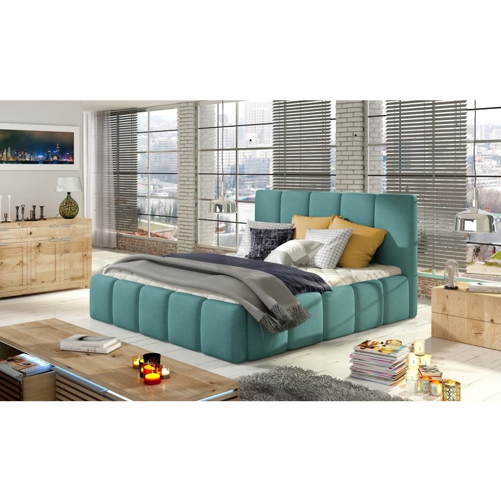Čalouněná manželská postel s úložným prostorem (box) včetně lamelových výklopných roštů od nohou.