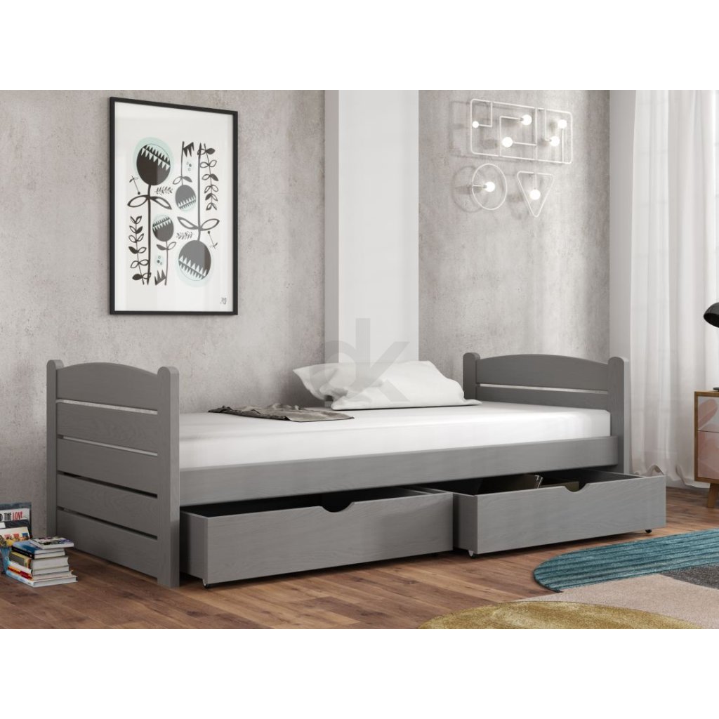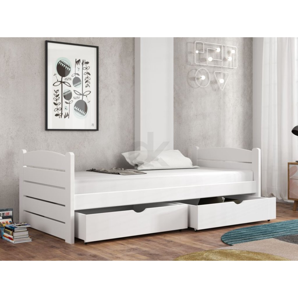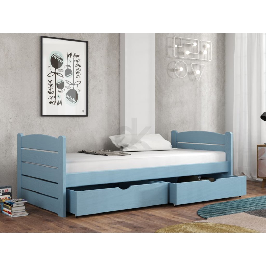 Postel Ula pro děti je dodávána včetně úložných prostorů na kolečkách a laťkového roštu.