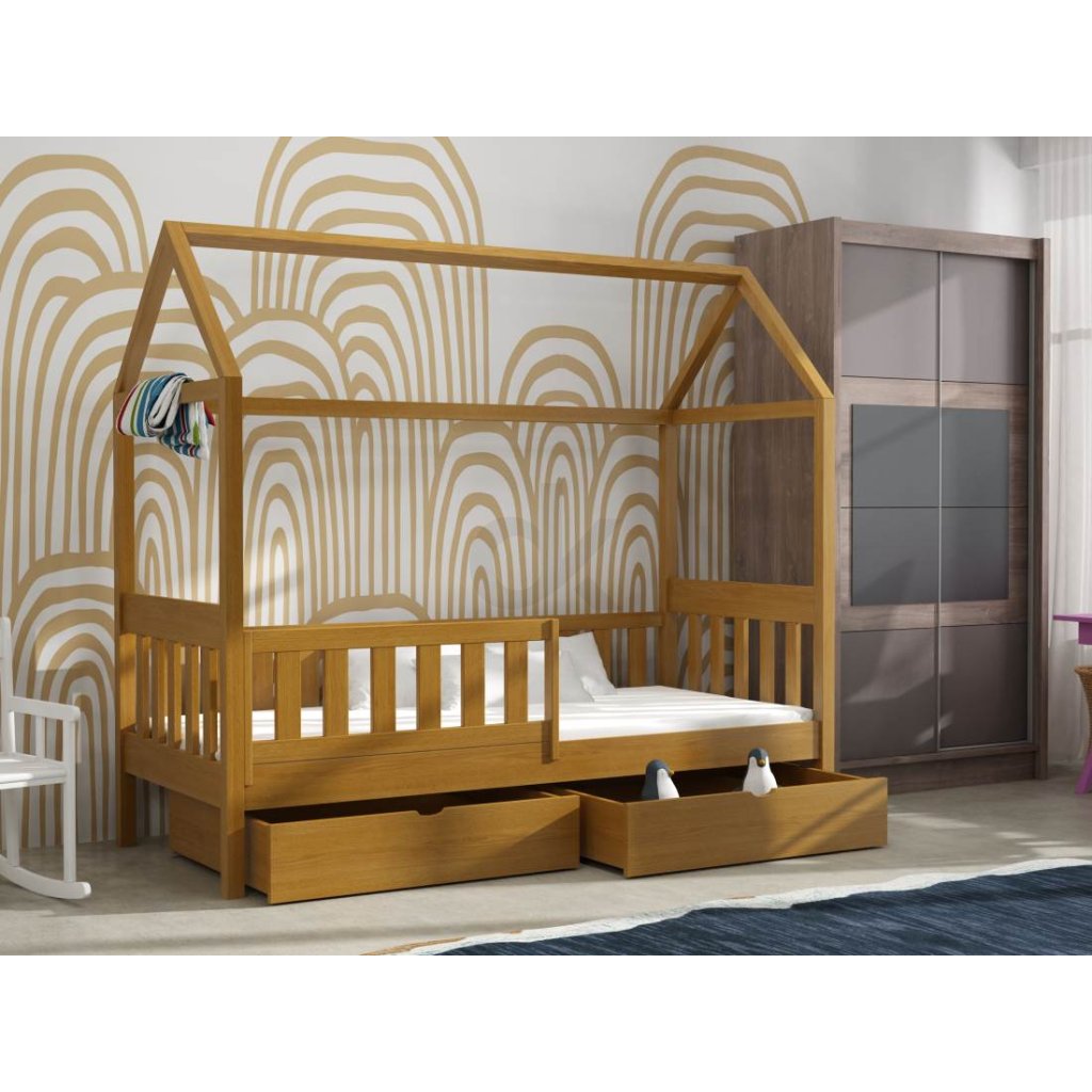 Dětská postel Marcela ve tvaru domečku je vyrobená z masivu borovice přírodní.