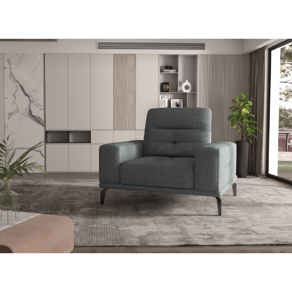 Klasické provedení křesla doplňují pevné ocelové nožičky v černé barvě.