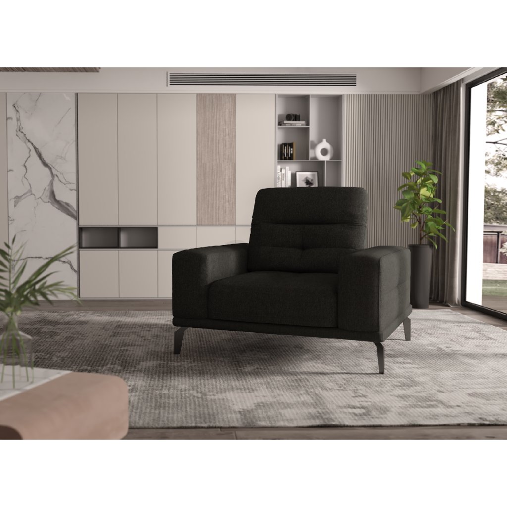 Klasické provedení křesla doplňují pevné ocelové nožičky v černé barvě.