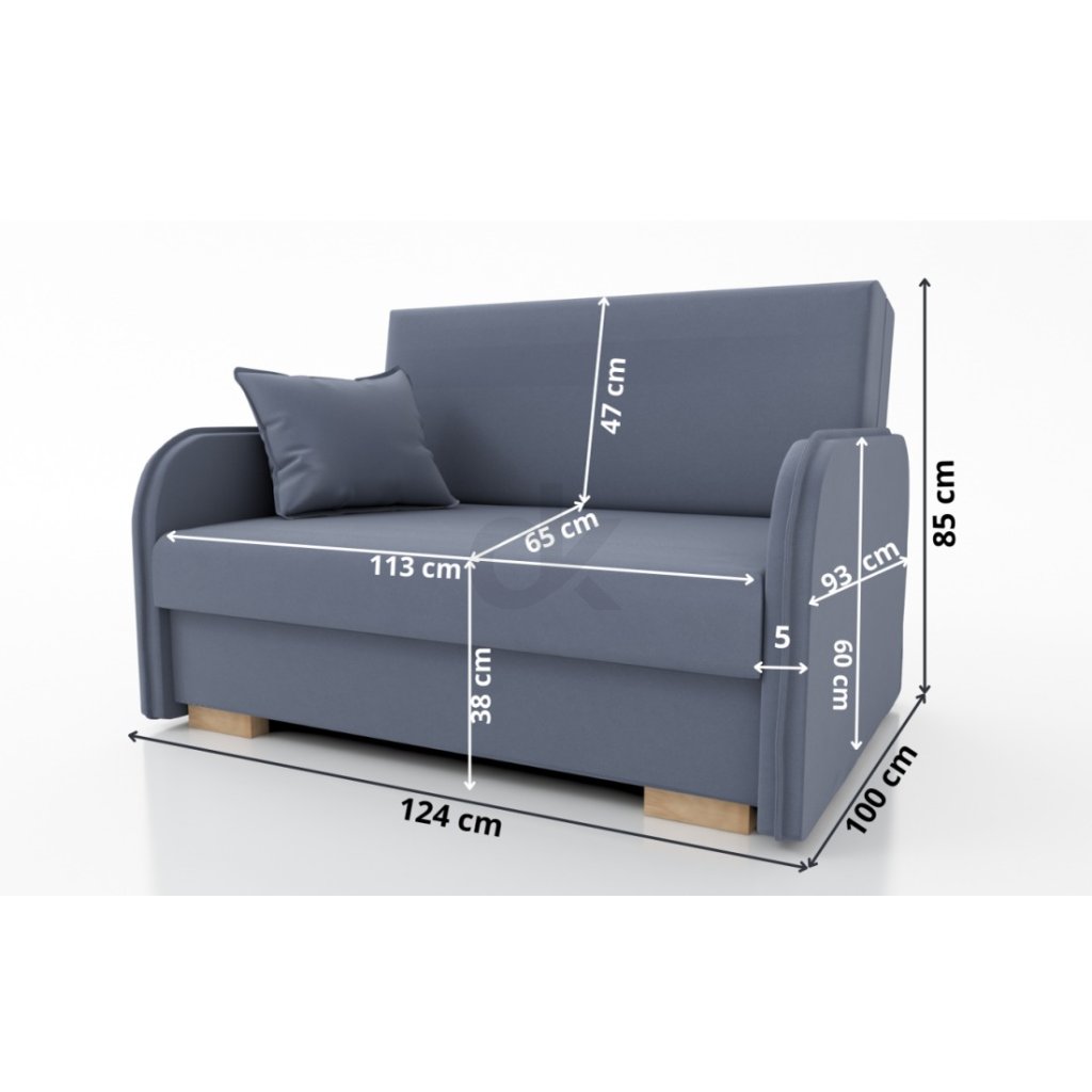 Rozměry jsou 124 cm na šířku, 100 cm na hloubku a 85 cm na výšku. Díky kompaktním rozměrům se pohodlně vejde i do menších místností a zároveň nabízí dostatečný prostor pro každodenní sezení i spaní.