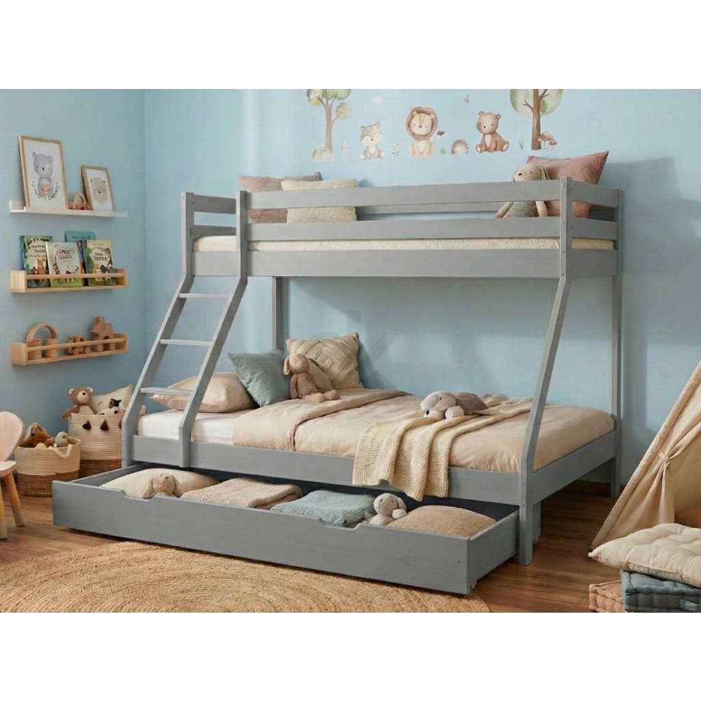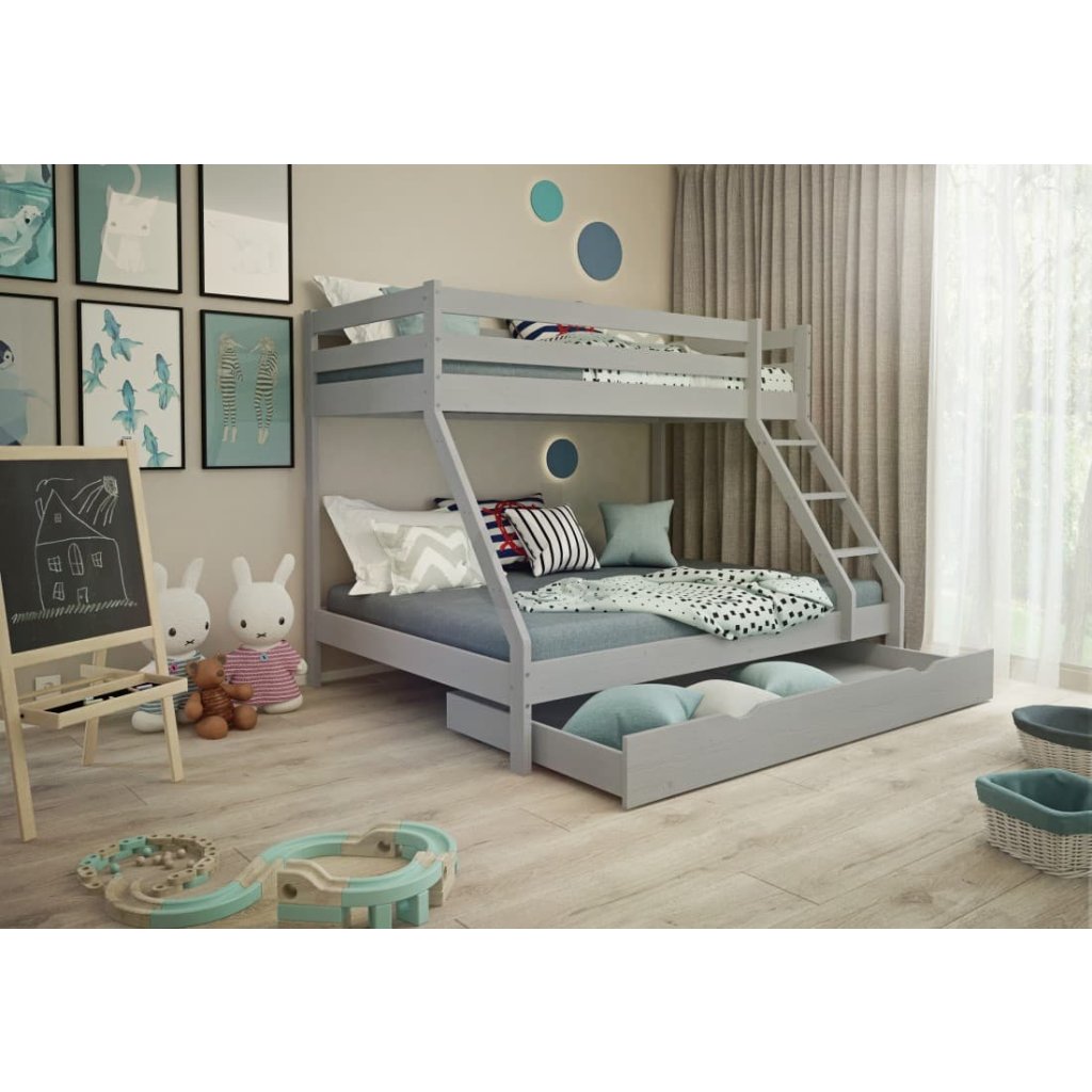 Patrová postel Denis v šedém provedení je zhotovena z přírodního borovicového masivu a je určena pro matrace o rozměrech 90x200 a 140x200 cm. Žebřík je možné instalovat na obě strany postele, což dodává flexibilitu při umisťování v místnosti. Spodní část postele je vyztužena středovou příčkou a podpěrnou nohou, což zajišťuje lepší stabilitu roštů. Povrch dřeva je ošetřen šedou barvou, která nechává vyniknout jeho přirozenou strukturu.