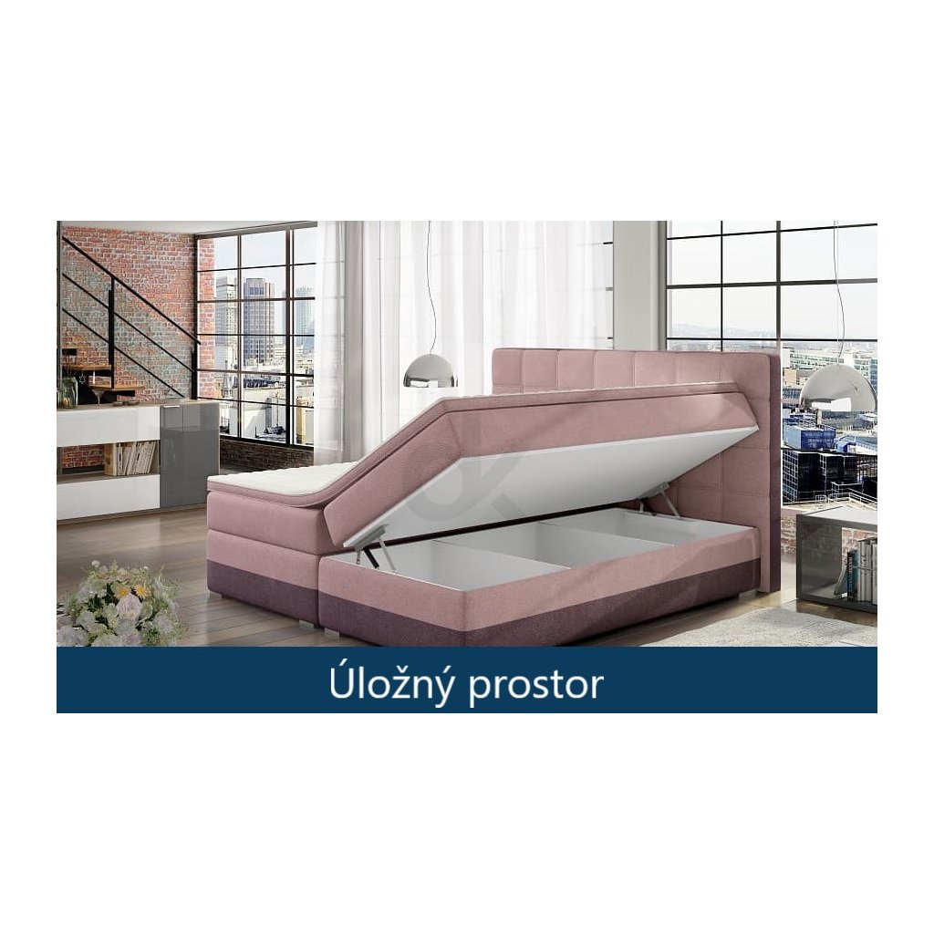 Čalouněná manželská postel s úložným prostorem včetně 2 ks matrací a 4 cm silného topperu v rozměrech 140/160/180 x 200 cm.