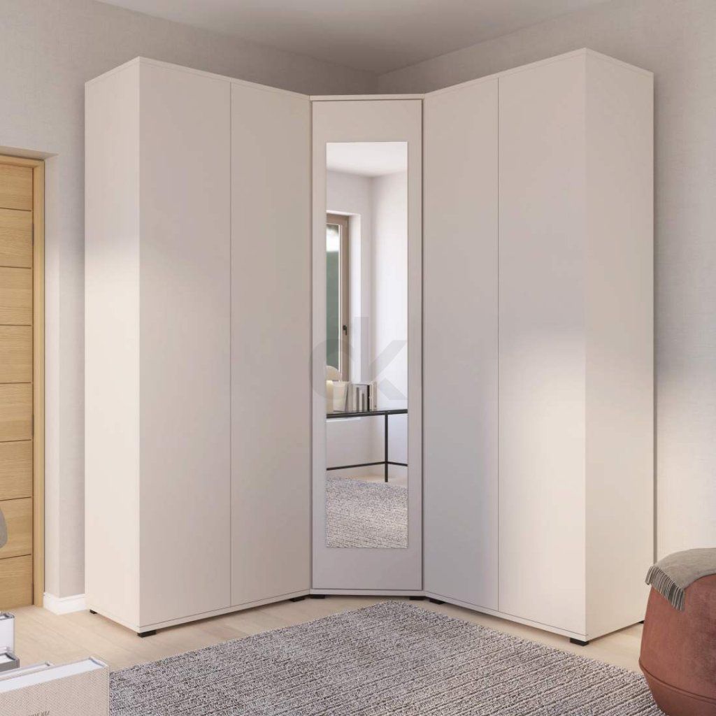 Rohová skříň je navržena tak, aby efektivně využila roh místnosti a nabídla maximum úložného prostoru bez zbytečného zabírání plochy. Toto řešení je ideální především do menších místností, ale skvěle poslouží i tam, kde chcete prostor využít co nejpraktičtěji. Skříň se zrcadlem nabízí kombinaci polic a prostoru pro zavěšení oblečení – uvnitř najdete dvě šatní tyče a čtyři police. Boční skříně jsou vybaveny jednou policí a výsuvným věšákem na ramínka. Do těchto bočních částí je možné dokoupit další police a přizpůsobit si tak vnitřní uspořádání podle vlastních potřeb.