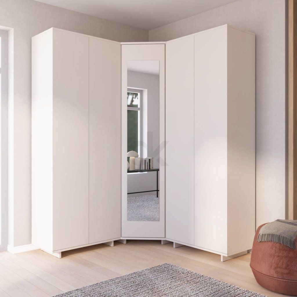 Rohová část je navržena tak, aby maximálně využila prostor v rohu místnosti a nabídla přehledné uložení oblečení. Uvnitř najdete čtyři police pro složené věci a dvě šatní tyče pro zavěšení kabátů, košil nebo šatů. Boční části navíc obsahují polici a výsuvný věšák na ramínka.
