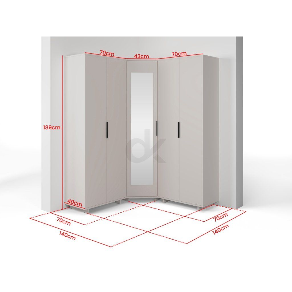 Má celkovou výšku 189 cm a délku podél stěn 140x140 cm, takže poskytuje dostatek úložného prostoru a přitom efektivně využívá roh místnosti. Díky promyšlenému vnitřnímu rozdělení nabízí kombinaci polic i tyčí pro zavěšení oblečení.