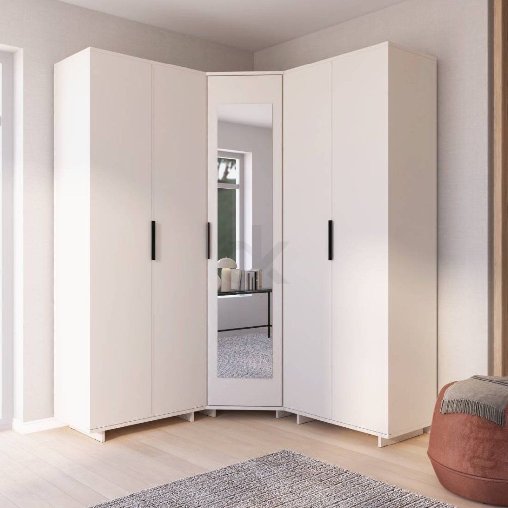 Rohová část sestavy je navržena tak, aby maximálně využila jinak hůře dostupný prostor v rohu místnosti. Vnitřní uspořádání je rozděleno na dvě části, které umožňují praktické rozdělení uložených věcí. Jedna strana obsahuje čtyři pevné police vhodné pro složené oblečení, doplňky, ručníky nebo úložné boxy. Druhá část je vybavena dvěma šatními tyčemi, které poskytují dostatek místa pro zavěšení různých druhů oděvů, například kabátů, šatů, košil nebo kalhot. Díky tomuto řešení zůstává obsah skříně dobře organizovaný a snadno dostupný.
