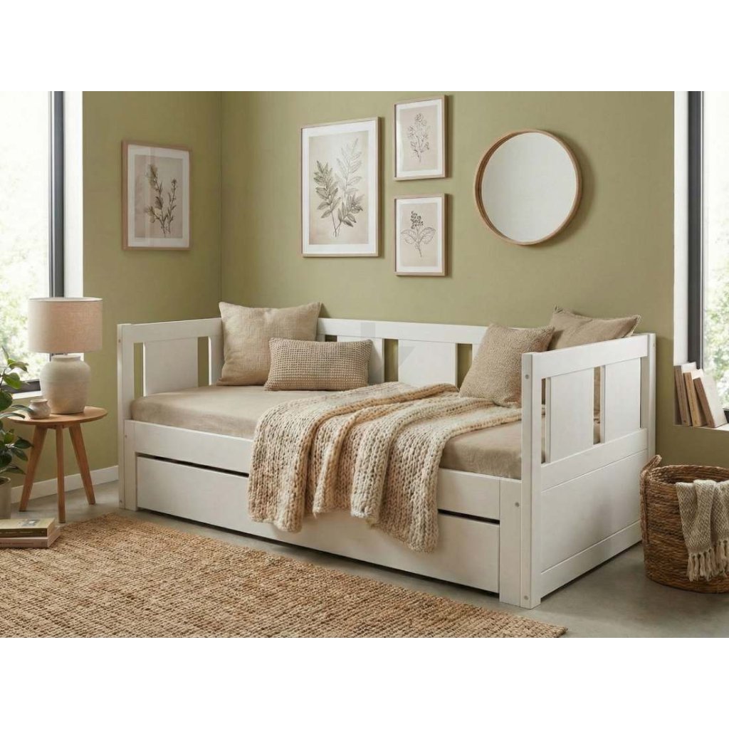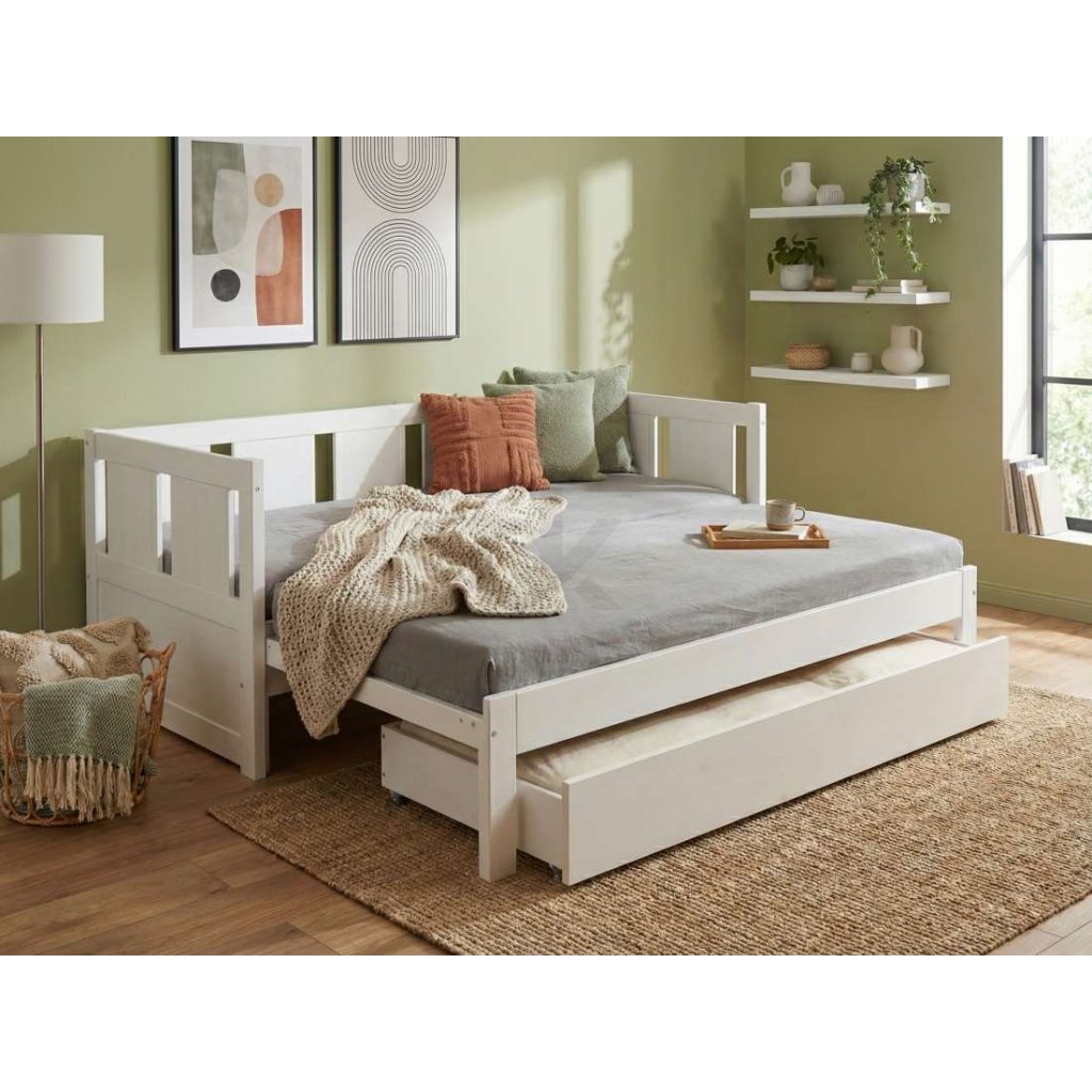 Bílá rozkládací výsuvná postel s úložným prostorem - masiv borovice