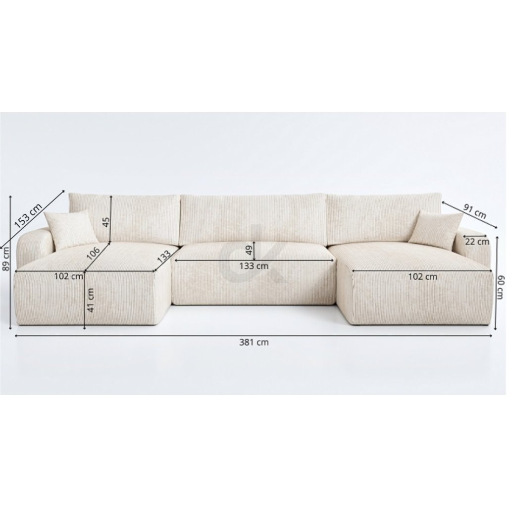 šířka 381 cm, hloubka 153 cm, výška 89 cm, výška sedu 41 cm - Funkce spaní