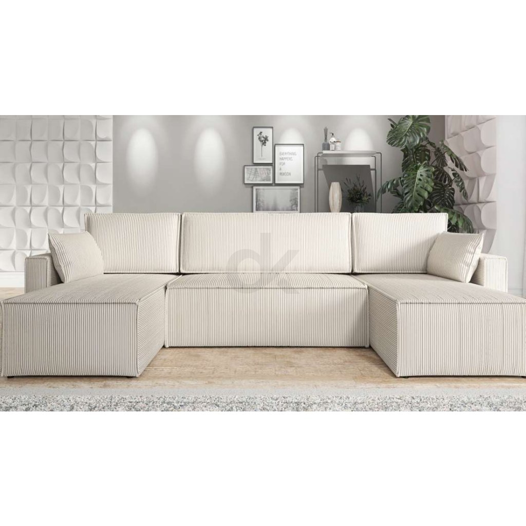 Moderní sedací souprava v nadčasové béžové barvě nabízí komfortní sezení i praktické řešení do velkého prostoru. Díky rozkládací funkci vytvoříte pohodlné lůžko o velikosti 285x131 cm během chvilky. Velký úložný prostor na lůžkoviny i precizně zpracované detaily z ní dělají ideální volbu pro každodenní rodinné využití. Vysoce kvalitní látka je odolná, jemná a příjemná na dotek, navíc s decentní strukturou připomínající manšestr. Sedák z pěny a vlnitých pružin poskytuje optimální oporu i dlouhodobé pohodlí.