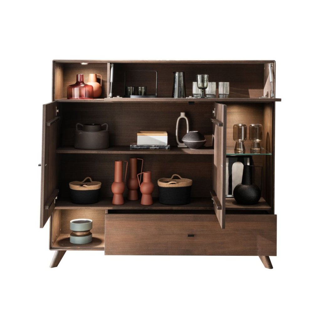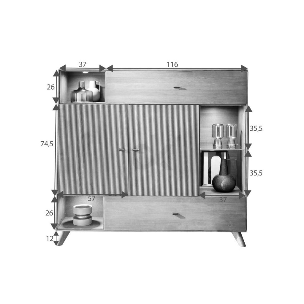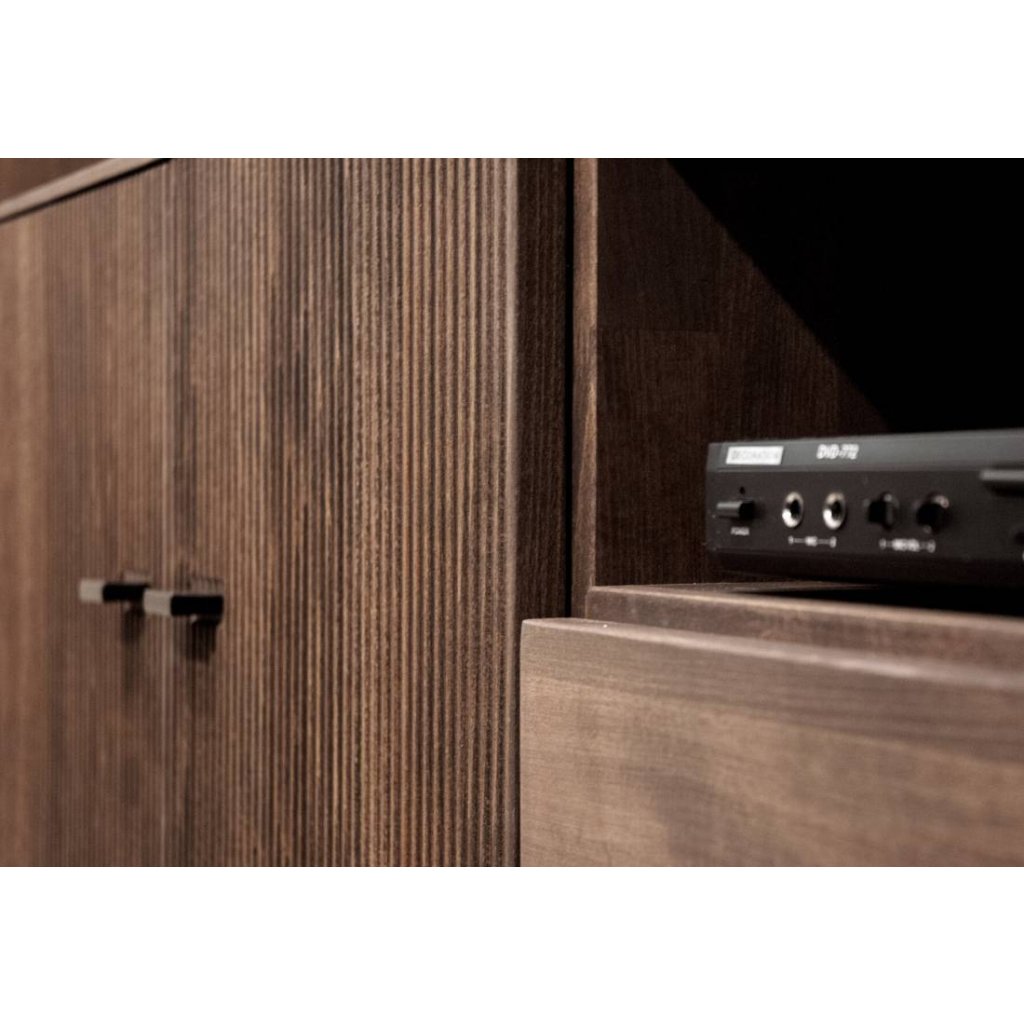 Komoda se vyznačuje frézovanými dvířky, které ukrývají praktickou polici. Obsahuje také výklopná dvířka, jednu zásuvku a tři otevřené police, což z ní činí velmi funkční kus nábytku.