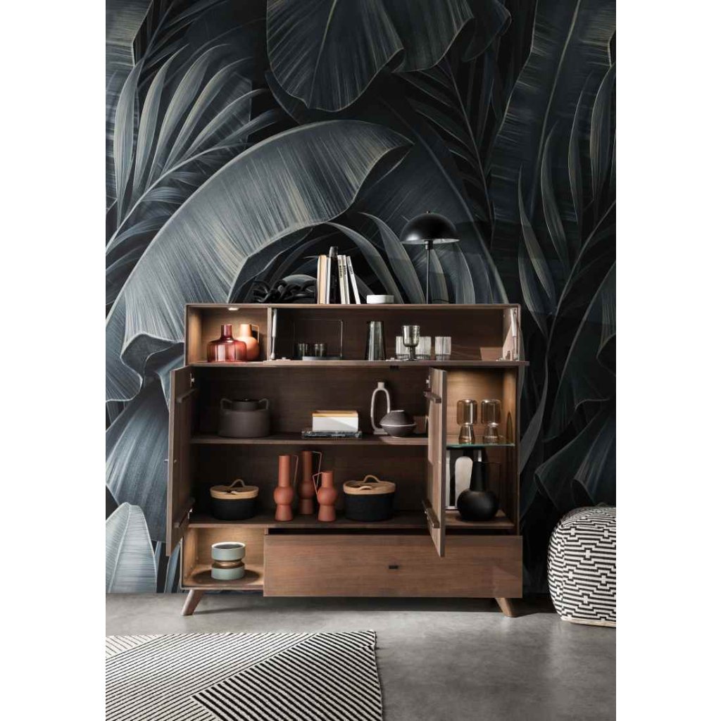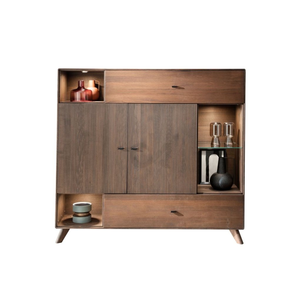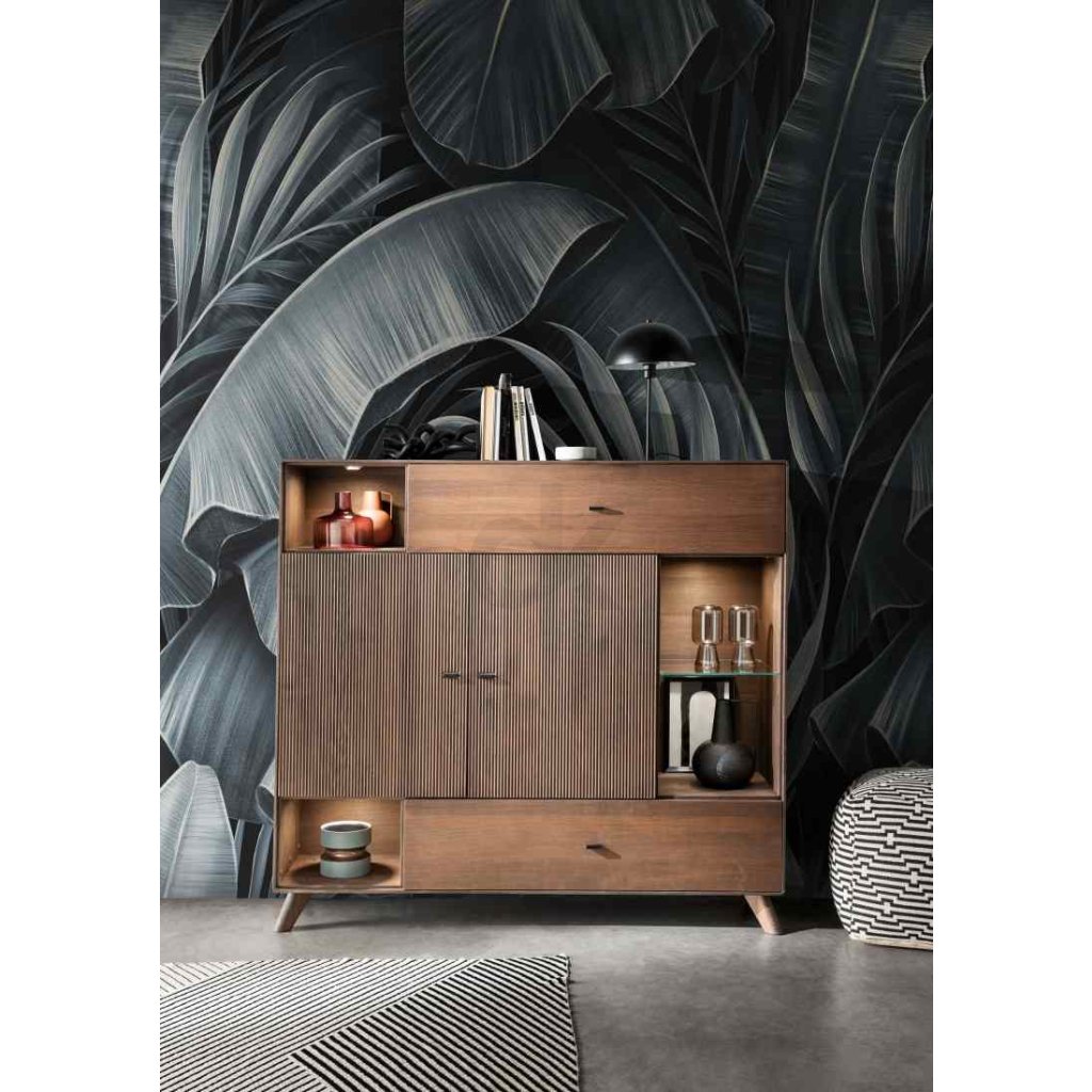 Komoda se vyznačuje frézovanými dvířky, které ukrývají praktickou polici. Obsahuje také výklopná dvířka, jednu zásuvku a tři otevřené police, což z ní činí velmi funkční kus nábytku.