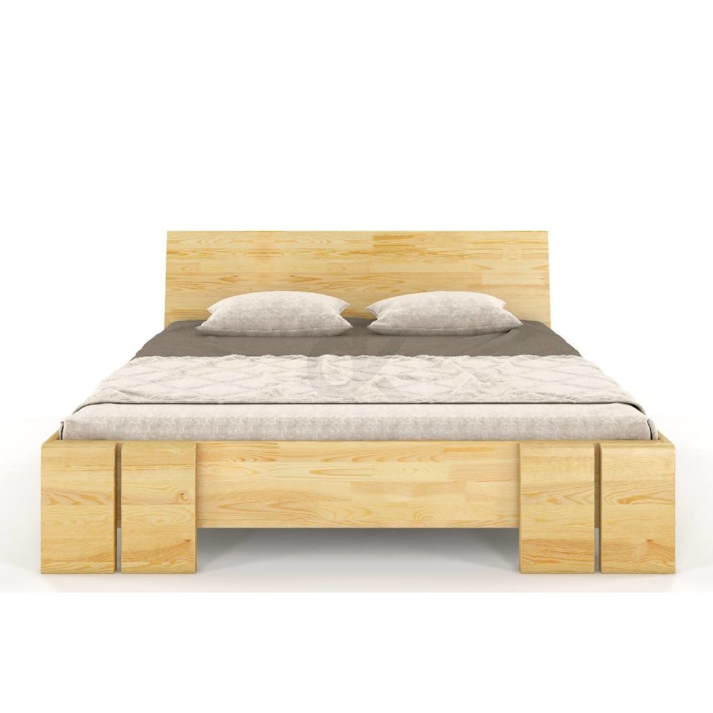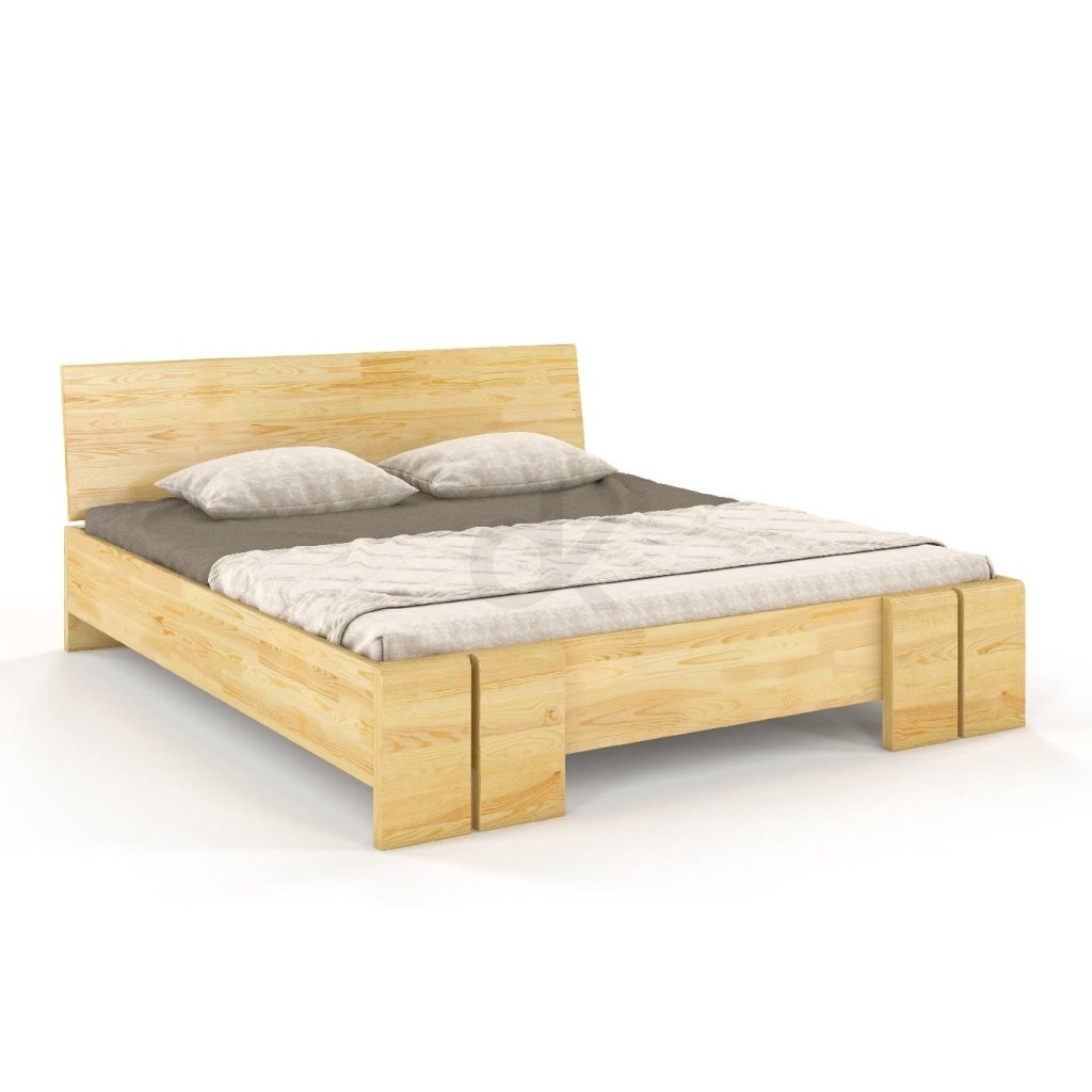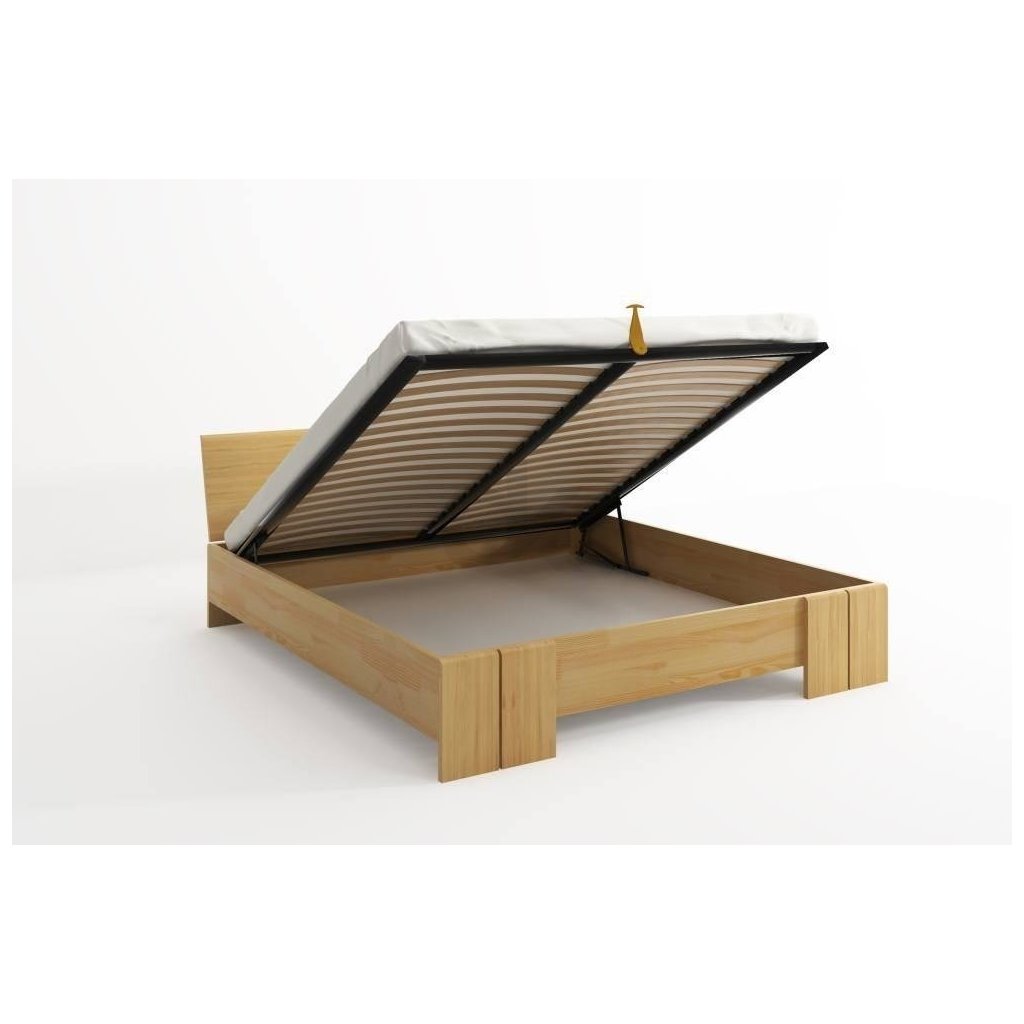 Zvýšená manželská postel s úložným prostorem je vyrobena z borovicového masivu.
