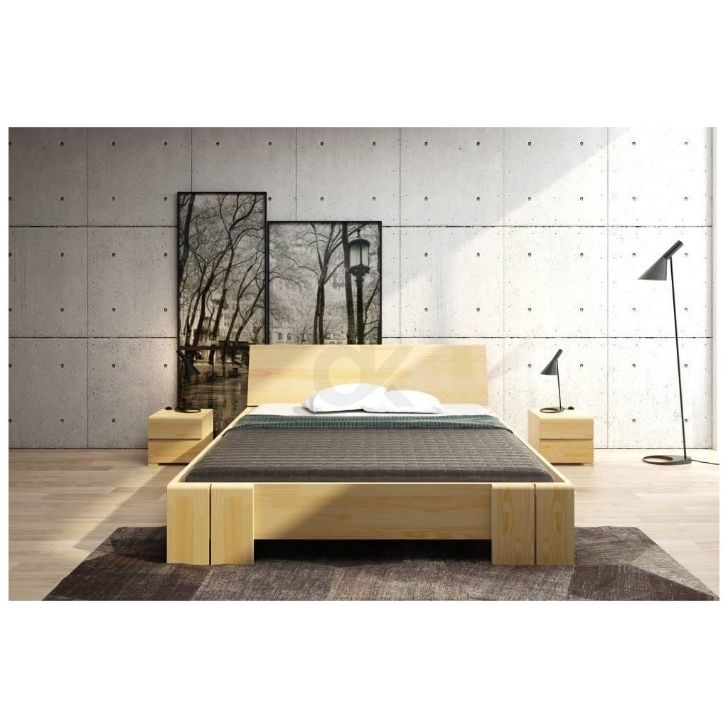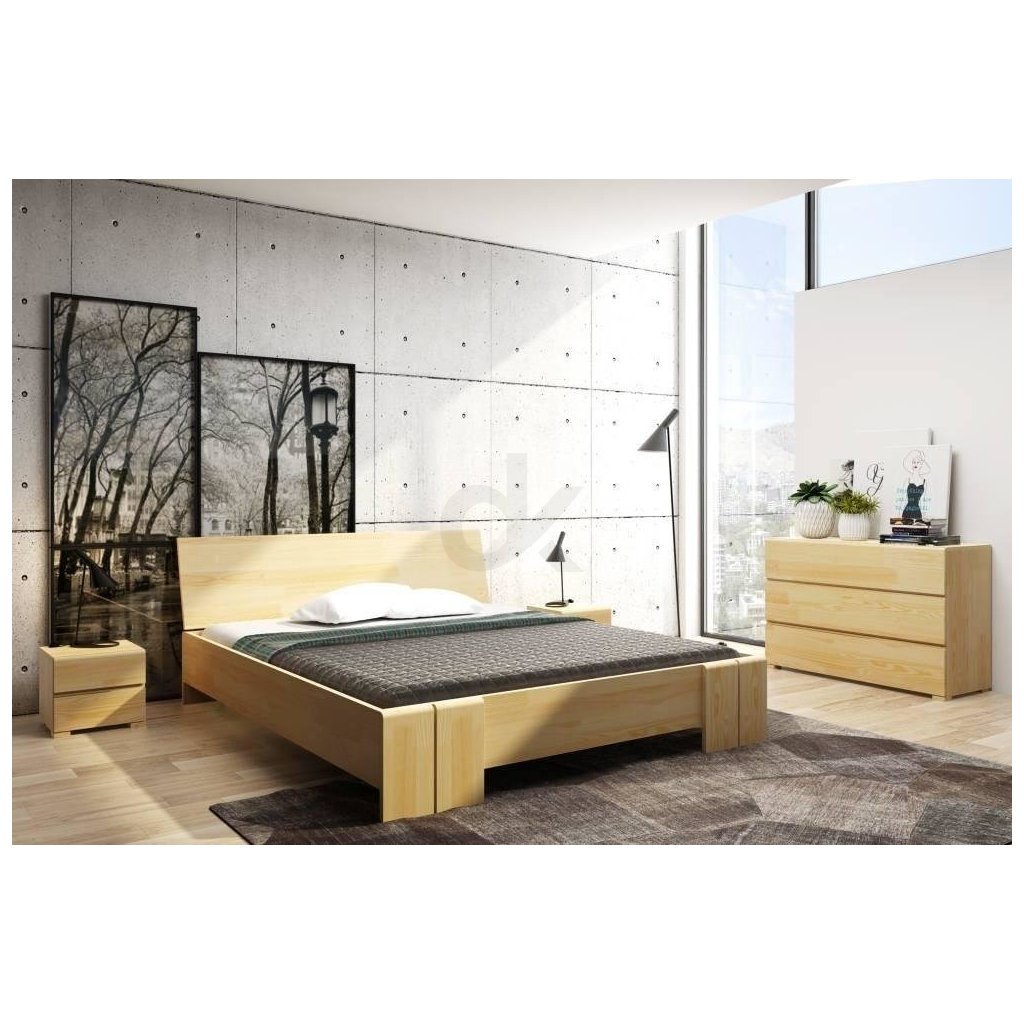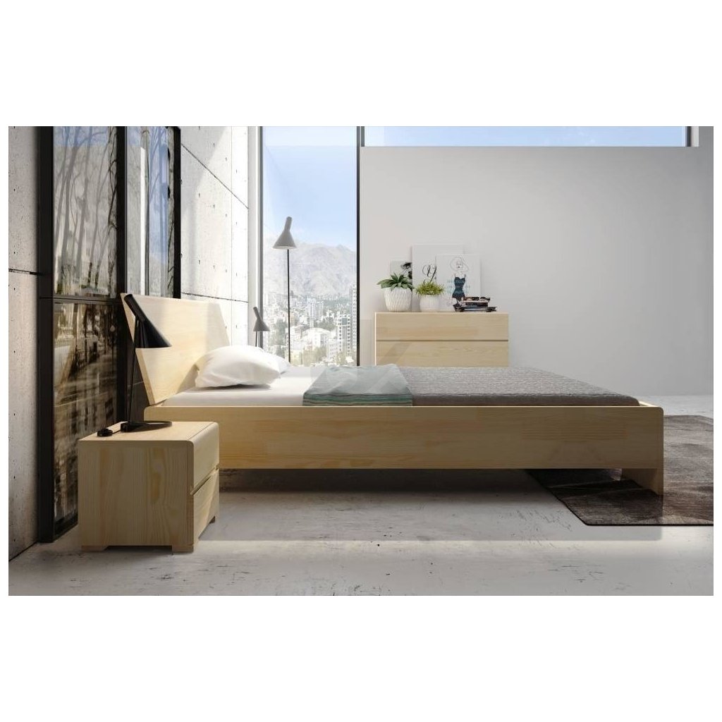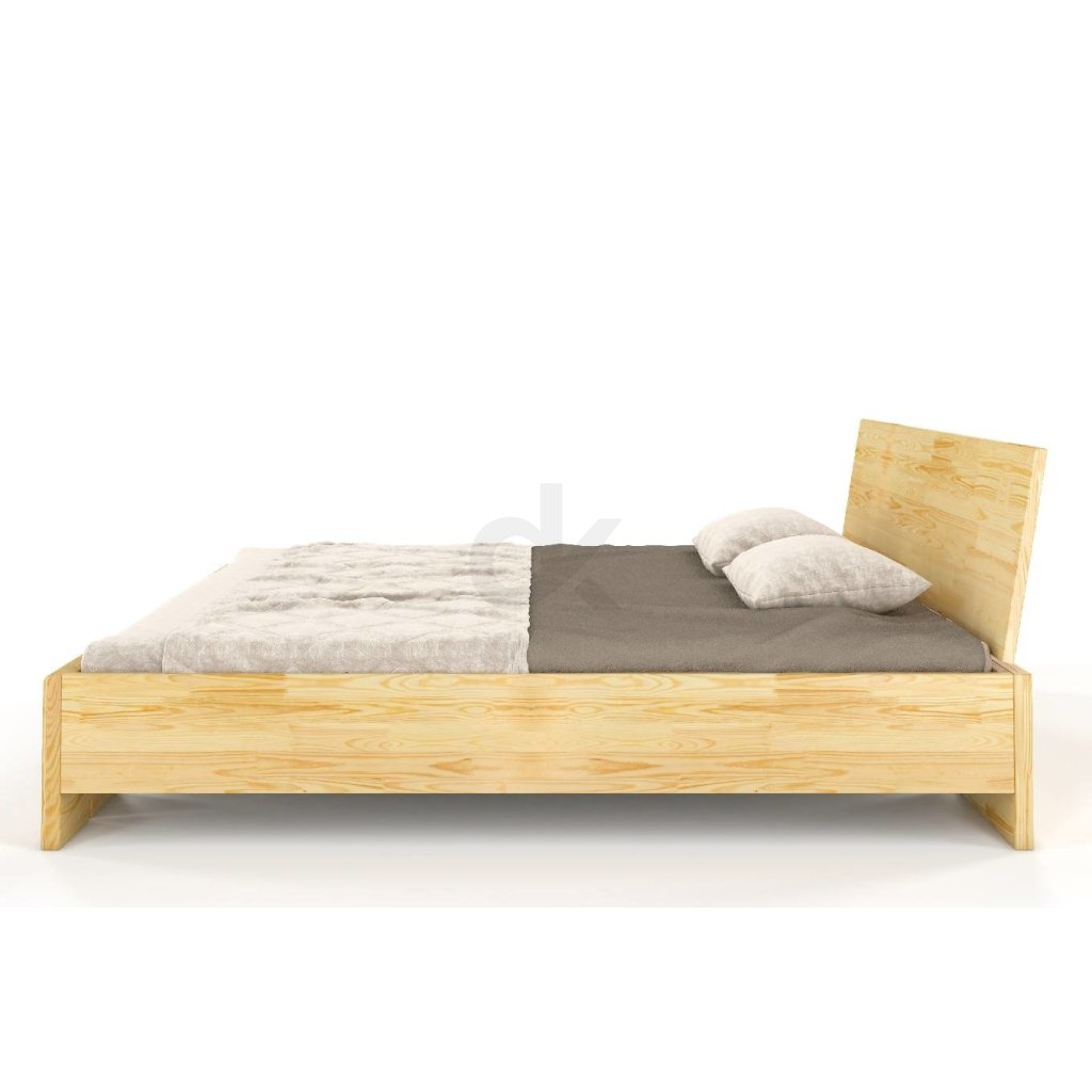 Zvýšená manželská postel s úložným prostorem je vyrobena z borovicového masivu.